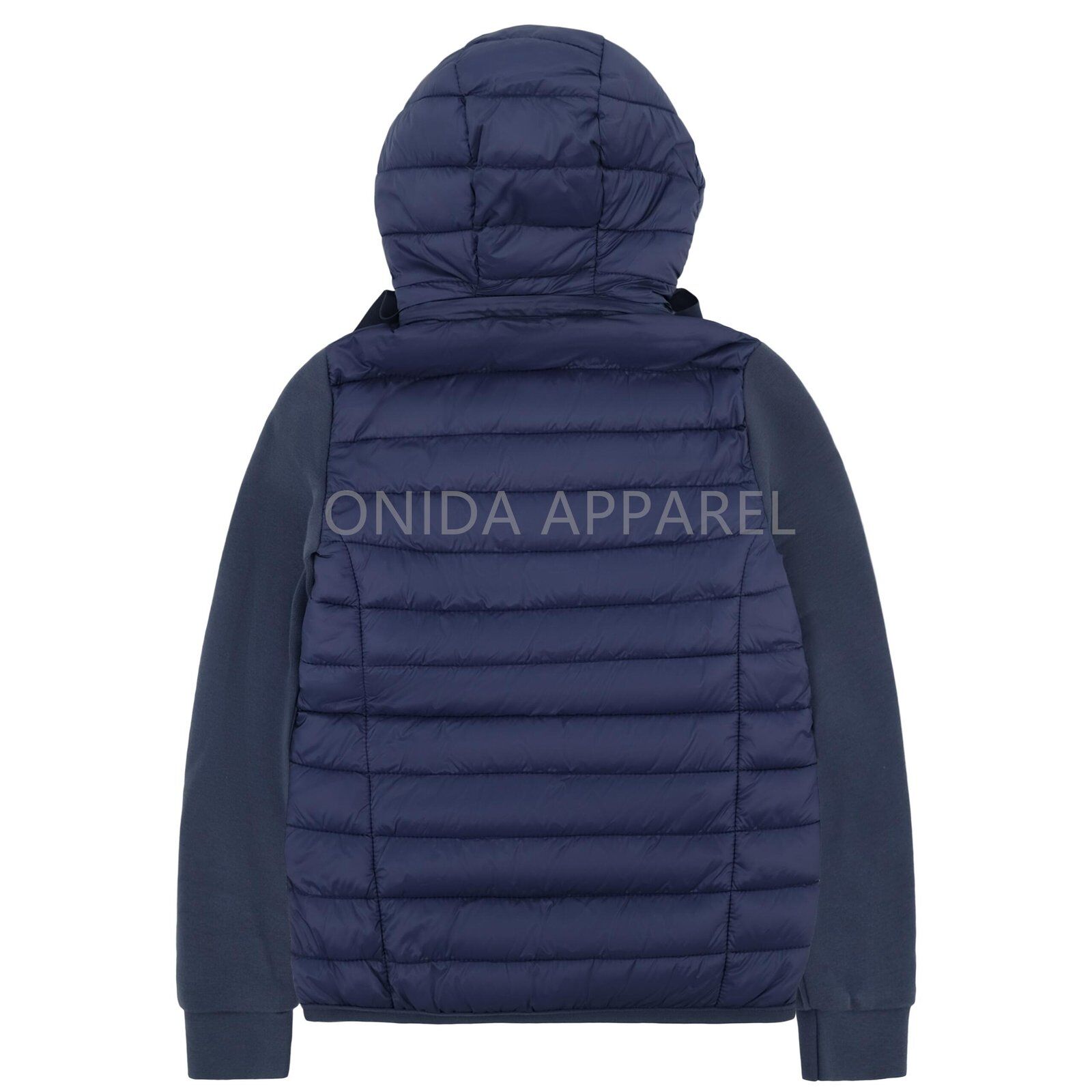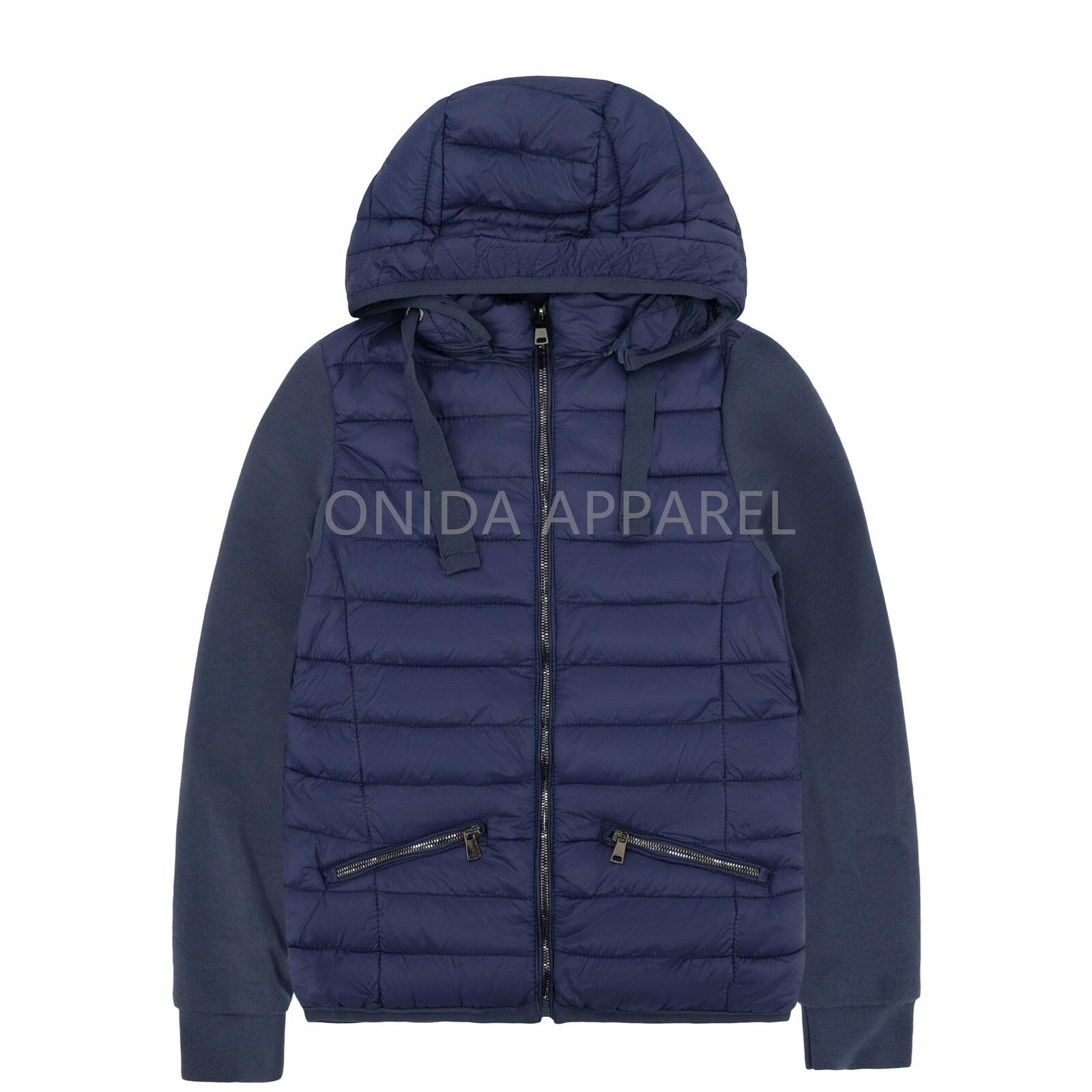 Ladies padding jacket with detachable hood and knitted sleeve.